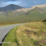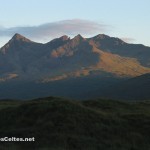 A l’ouest des Cuillin Hills la route A863 traverse le Glen Drynoch, qui s’étend entre Drynoch (non loin de la fameuse distillerie de Talisker, unique whisky de Skye, mais quel whisky !) et Sligachan, au croisement avec la A87, principale route de l’île. La route traverse (c’est une habitude à Skye !) de vastes tourbières en gardant à l’oeil les superbes montagnes des Cuillin Hills. Le soleil qu’on a dans le dos dans cette vallée (en tout cas dans le sens qu’on a pris !) fait ressortir les lignes harmonieuses de ce qui semble être d’anciens volcans. Absolument magnifique ! Mais que dire alors du coucher de soleil sur ces mêmes montagnes lors du retour vers Broadford après une pause à Portree … Les montagnes prennent une teinte orangée extraordinaire ! Une vision paradisiaque … Mais les midges sont très vite présents pour vous ramener à la réalité. Et oui, j’ai souffert pour prendre ces photos ! Mais vous serez d’accord : ça en valait la peine !