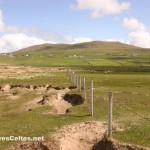 - Un peu plus au nord, la longue plage de White Strand, qu’on domine depuis la route vers Louisburgh, fait face à l’île de Inishturk. La plage est coupée en deux par une rivière qui descend des Mweelra Mountains et se jette dans l’océan après plusieurs petits méandres. De douces collines parsemées de maisons descendent doucement vers la mer et se terminent par des dunes sur lesquelles pousse une herbe broutée par les moutons et habitée par des milliers de lapins qui détalent dans tous les sens à chaque bruit suspect !